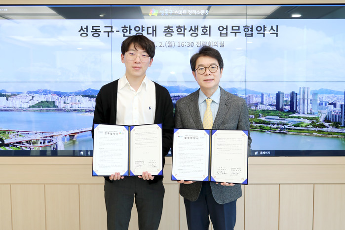 서울 성동구는 지난 2일 한양대학교 총학생회와 대학생의 복리증진 및 구정발전을 위한 포괄적 업무협약(MOU)를 체결했다. 주요 내용은 민관협력 기숙사인 ‘성동한양 상생학사(보증금 100만원, 월세 20만~30만원)’ 수혜대상 확대 등이다. 사진은 협약식에서 정원오 구청장(오른쪽)이 관계자와 기념촬영을 하는 모습.
