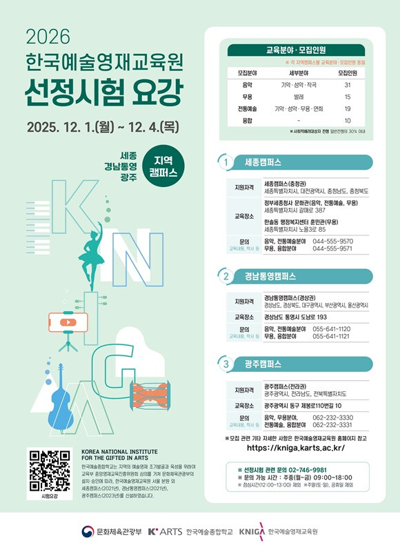 자세한 사항은 한국예술영재교육원 누리집을 참고하거나 한국예술영재교육원 교육지원팀으로 문의하면 된다.