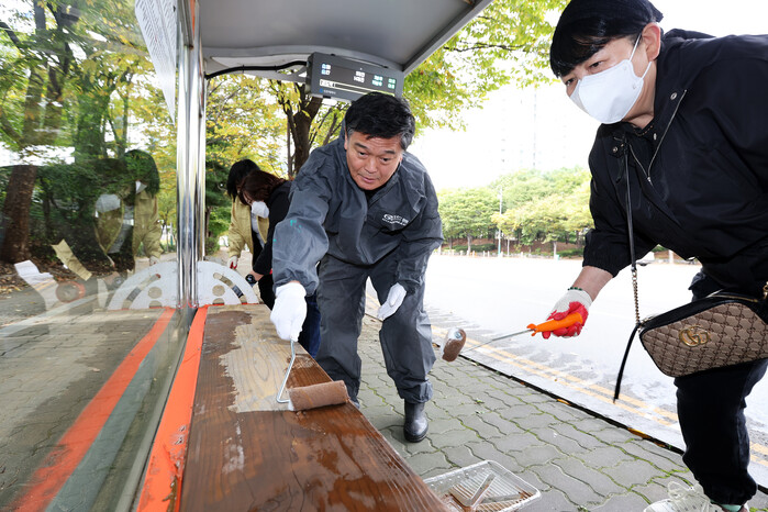 참여자들은 낡은 버스정류장 벤치를 닦고 페인트를 칠하며, 환경개선에 나섰다.