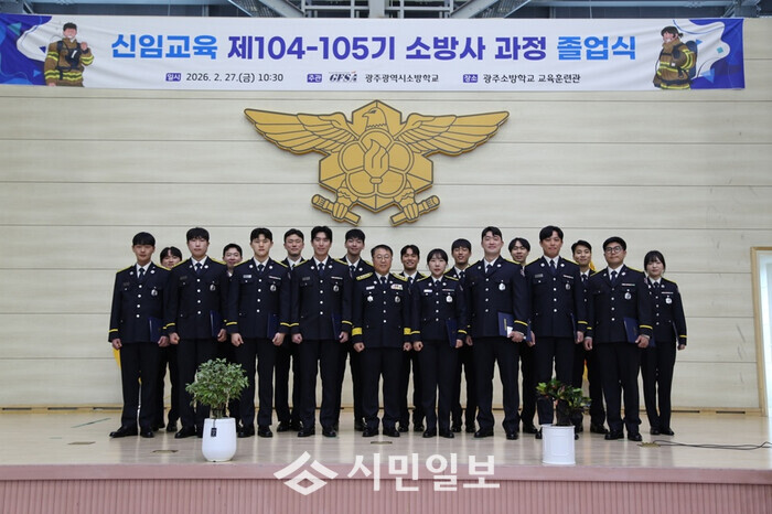 [광주=정찬남 기자] 광주광역시 소방학교는 27일 교육훈련관에서 제104·105기 신임교육 소방사 과정 졸업식을 개최했다.