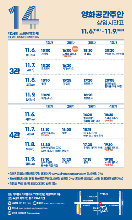 영화공간주안 관계자는 “올해 스웨덴영화제는 개성 있는 작품들이 선보여지는 만큼, 스웨덴 영화가 지닌 감성과 사회적 시선을 한층 폭넓게 경험할 수 있을 것”이라며, “시민들의 많은 관심과 참여를 바란다.”라고 말했다.
