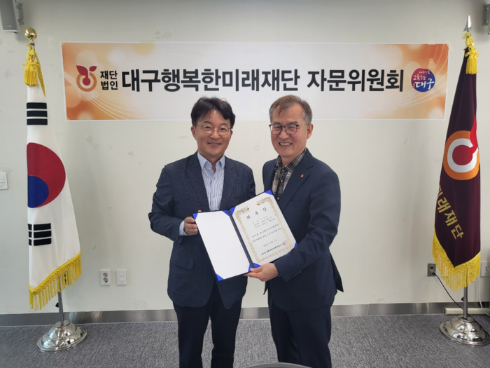 대구행복한미래재단에서 위촉장 수여 후 사공정규 자문위원(좌)과 박정곤 대구행복한미래재단 대표(우)가 기념촬영을 하고 있다.(사진제공 : 대구행복한미래재단)