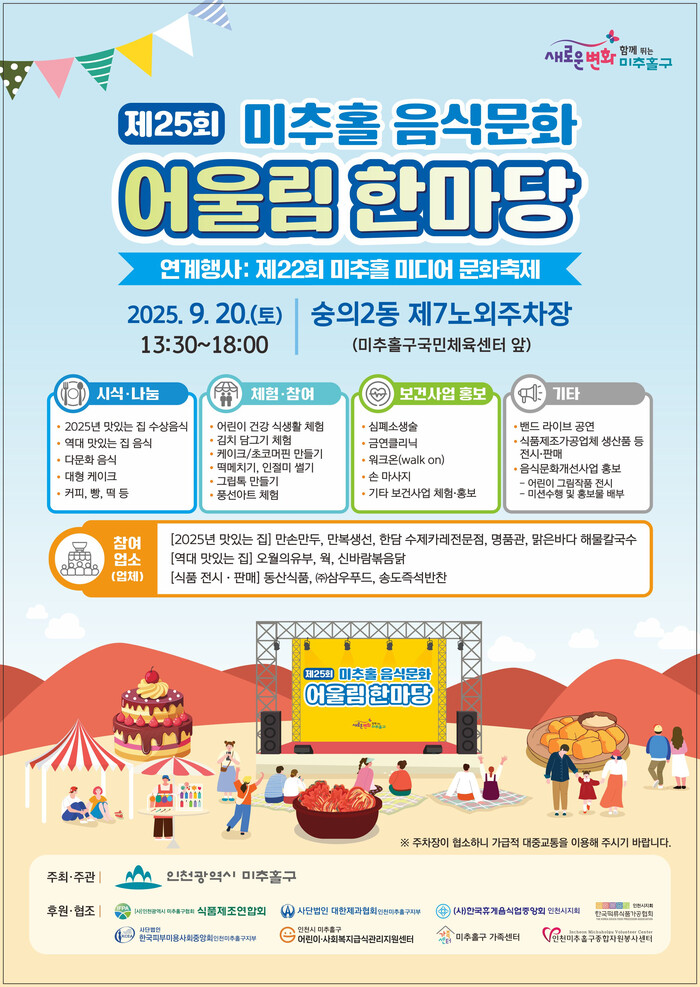 [인천=문찬식 기자] 인천 미추홀구(구청장 이영훈)는 오는 20일 숭의2동 제7노외주차장(미추홀구국민체육센터 앞)에서 ‘제25회 미추홀 음식문화 어울림 한마당’을 개최한다.