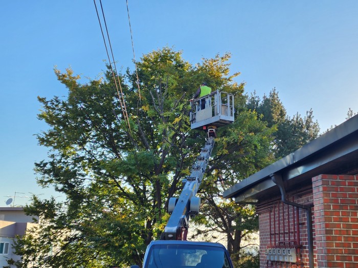| ▲ 위험수목에 가지치기를 하고 있는 모습. (사진=강북구청 제공) |