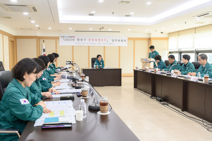 양천구가 9일 하영태 부구청장 주재로 ‘폭염대책본부 긴급대책회의’를 개최하고 철저한 폭염 피해 대비에 나섰다. 이날 회의는 야외 근로자 및 공사장 안전관리 강화, 도로 물청소 강화, 취약계층 보호계획 등에 대해 집중 논의가 이뤄졌다. 사진은 하 부구청장이 회의를 진행하는 모습. (사진=양천구청 제공)