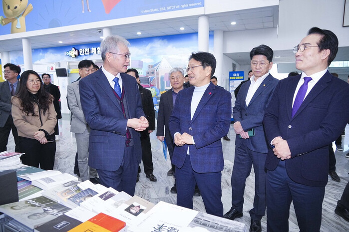 | ▲ 강기정 광주광역시장(사진 가운데)이 18일 오전 시청 시민홀에서 열린 ‘광주광역시 공공기관 광주정책연구회 정책박람회’에 참석해 전시포스터를 살펴보고 있다./광주광역시 제공 |