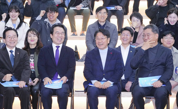 | ▲ 강기정 광주광역시장(사진 앞줄 오른 쪽부터 두 번째)이 18일 오전 시청 시민홀에서 열린 ‘광주광역시 공공기관 광주정책연구회 정책박람회’에 참석해 각 기관장들과 담소를 나누고 있다./광주광역시 제공 |