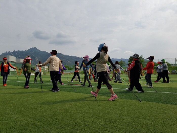 노르딕 워킹은 일반걷기보다 운동효과가 높고 자세 교정에 탁월한 효과가 있어 특히 하체근력이 약한 어르신들에게 적합한 운동이다.