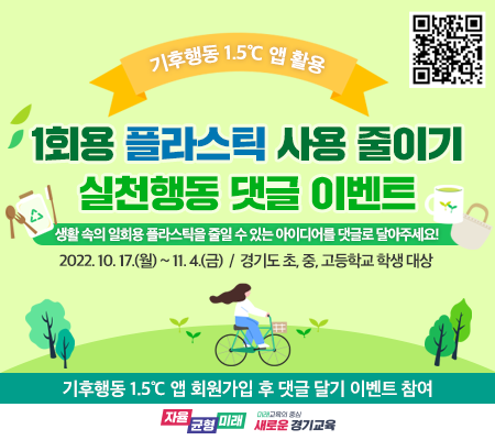 오는 11월4일까지 진행되는 이번 행사는 도내 초, 중, 고 재학생들을 대상으로 1회용품 없는 학교를 만들기 위한 구체적인 실천 방법을 이끌어내는 것으로 환경부가 만든 ‘기후행동 1.5℃ 앱’을 통해 진행한다. 이번에 학생들이 제안한 의견은 2023년 경기 생태전환교육 정책 수립에 반영할 예정이다.
