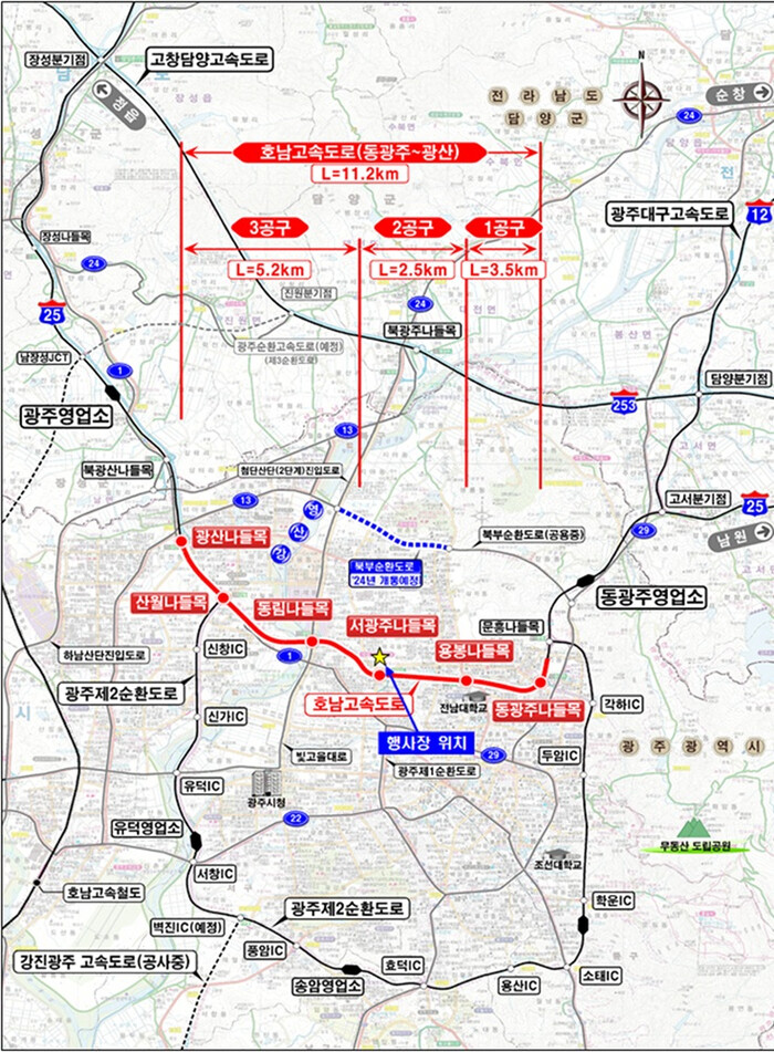 호남고속도로 확장사업에는 총 7934억 원이 투입된다. 국비 등 중앙정부 및 한국도로공사 부담 50%, 광주시 지방비 부담 50%로 재원을 분담하며, 한국도로공사가 사업을 시행한다 .