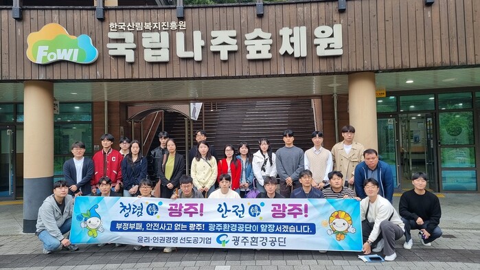 | ▲ 광주환경공단, 22일 직원 및 신규직원 대상 ‘청렴과 인권 그리고 힐링’을 주제로 전남 나주시 소재 국립나주숲체원에서 '청렴 힐링 캠프' 운영기념촬영 / 광주환경공단 제공. |