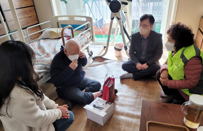 경기 남양주시 다산2동 지역사회보장협의체는 7일 부양의무자가 없는 저소득 홀몸노인 2가정을 방문해 생일축하 자리를 마련하고, 건강식품 등의 선물과 함께 다산동 아벵브레드가 후원한 케이크를 전달했다. 사진은 이날 대상노인 가구에서 생일축하를 하고 있는 모습. (사진제공=남양주시청)