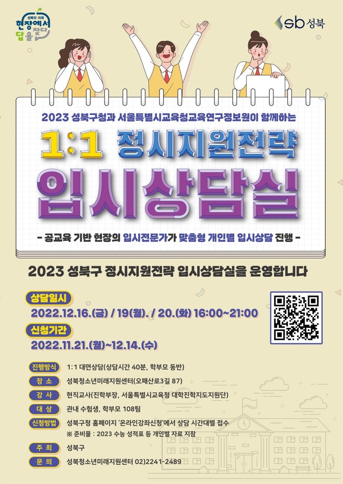 구는 오는 12일 열리는 '2023 성북구 정시지원전략 입시설명회'에 이어 16·19·20일 3일간 수험생과 학부모 약 108팀 220명을 대상으로 서울특별시교육청 대학진학지도지원단 소속 현직교사 15인과 매칭해 입시상담실을 운영할 예정이라고 밝혔다.
