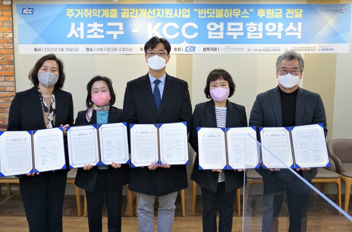 서울 서초구가 최근 (주)KCC와 주거환경 개선이 시급한 저소득 가정을 대상으로 주거 환경 개선을 지원하는 ‘반딧불하우스’ 업무협약(MOU)을 체결했다. 사진은 협약식에서 관계자들이 기념촬영을 하는 모습. (사진제공=서초구청)
