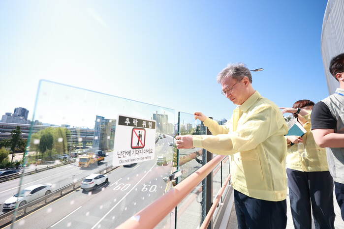 구로구가 최근 고척스카이돔에서 열린 ‘광복 80주년 KBS대기획 조용필 콘서트’의 안전한 개최를 위해 현장점검을 실시했다. 사진은 장인홍 구청장이 난간 등 시설물 상태를 점검하는 모습. (사진=구로구청 제공)
