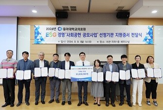 [부산=최성일 기자] 동아대병원(병원장 안희배)은 지난 9일 동아대병원 세미나실에서 ESG 경영 '사회공헌 공모사업' 선정기관 지원증서 전달식을 개최했다. 동아대병원은 부산지역의저소득층과 소외계층을 위한 사회복지사업을 발굴하고 지원하기 위해 마련한 이번 공모사업에서 10개 사업을 최종 선정했다. 부산시 사하구 두송종합사회복지관(관장 김동현)을 비롯한 10개의 선정된 기관이 모여 지원증서를 전달했다. 선정기관에는 동아대 병원 교직원의 후원금으로 마련하여 사업 당 300만 원씩 총 3000만 원을 지원한다. 두송종합사회복지관은 선정된 예산으로 지역의 환경개선 사업을 진행할 예정이다. ▲ 환경인식교육▲ 폐의약품 수거 ▲ 업사이클링 등 다양한 활동을 통해 지역주민의 생활 속 기후위기 대응 행동을 증진하여 9월~12월까지 활동할 예정이다.