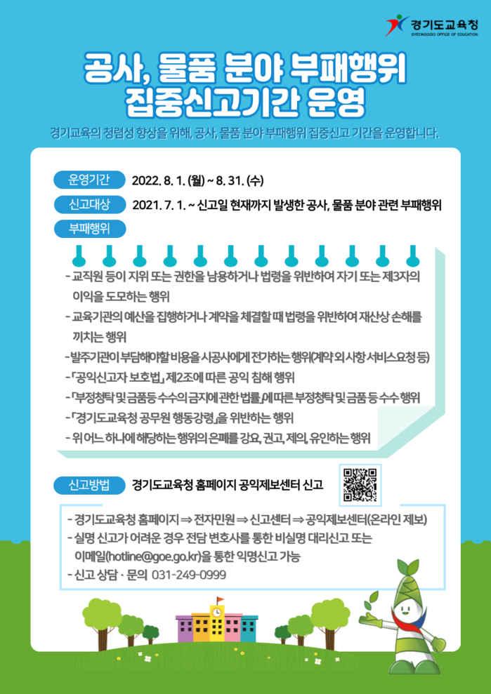 또 통계상 갑질 신고 건수가 많은 7월은 갑질 행위 집중 신고 기간으로 운영하고 방학 기간을 이용해 학교 시설 공사가 많은 8월은 물품·공사 관련 부패 행위 집중 신고 기간을 운영한다.