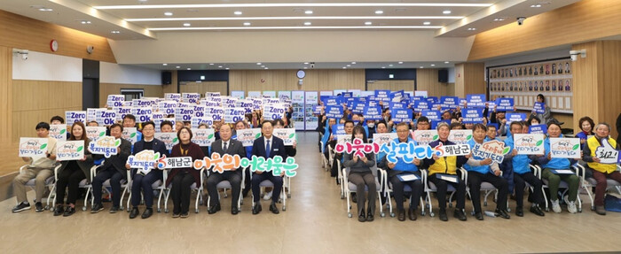 | ▲ 명현관 해남군수(앞줄 왼 쪽부터 7번 째)가 이성옥 해남군의회 의장(6번 째), 군의원 등과 복지기동대 역량강화 교육에 참석해 "해남군 이웃의 어려운 이웃을 살핀다" 표어 퍼포먼스를 하고 있다. / 해남군 제공 |