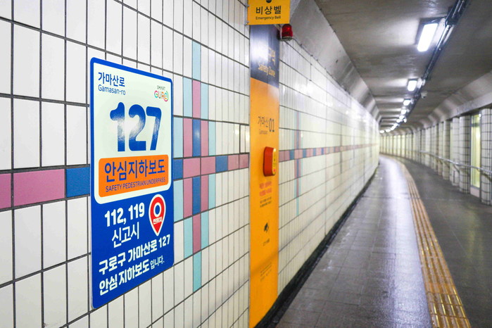 먼저 안심지하보도 안내표지판에는 '내 위치는 구로구 OO로(도로명) OOO(기초번호) 안심 지하보도입니다'라는 문구가 써져있다.