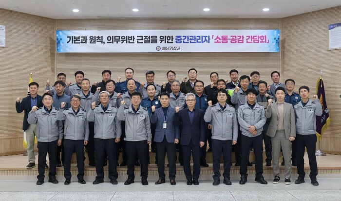 [해남=정찬남 기자] 전남 해남경찰서는 25일 경찰서장이 주관해 각 과장, 계ㆍ팀장, 지역관서장이 참여한 가운데 의무위반 예방을 위한 중간관리자 소통 간담회를 가졌다.
