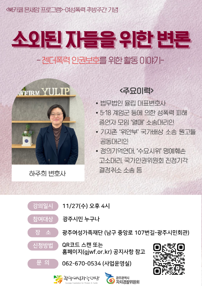 여성폭력추방주간(11월25일~12월1일)을 맞아 열리는 이번 특강에서는 하주희 법무법인 율립 대표변호사가 ‘소외된 자들을 위한 변론’을 주제로 젠더폭력 인권보호를 위한 여러 활동에 대해 이야기를 나눈다.