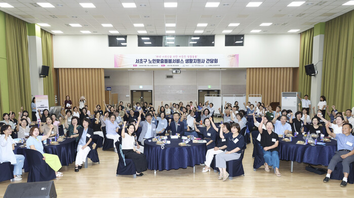 서초구가 27일 구청 2층 대강당에서 노인맞춤돌봄서비스를 수행 중인 생활지원사와 전담 사회복지사 등 약 100여명이 참석한 가운데 ‘노인맞춤돌봄서비스 생활지원사 간담회’를 개최했다. 사진은 전성수 구청장이 간담회 관계자들과 기념 촬영을 하는 모습. (사진=서초구청 제공)