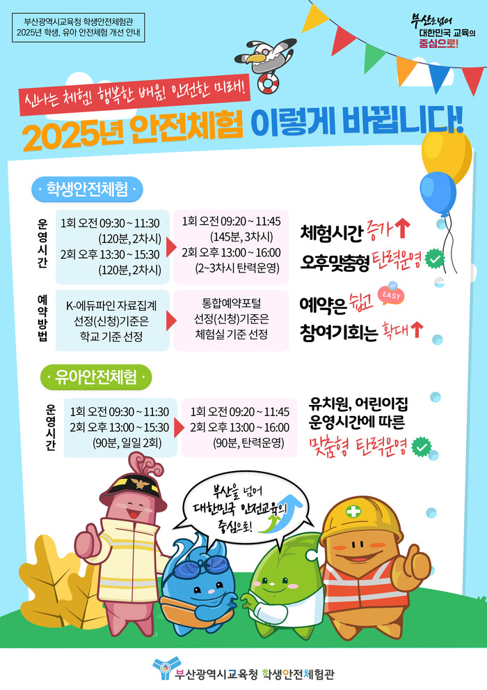 유아 안전체험은 유치원과 어린이집 운영시간에 맞춰 체험시간을 조정할 수 있도록 탄력적으로 운영한다. 또한 부산광역시교육청 통합예약포털을 통해 보다 쉽고 간편한 예약서비스를 제공하였다.