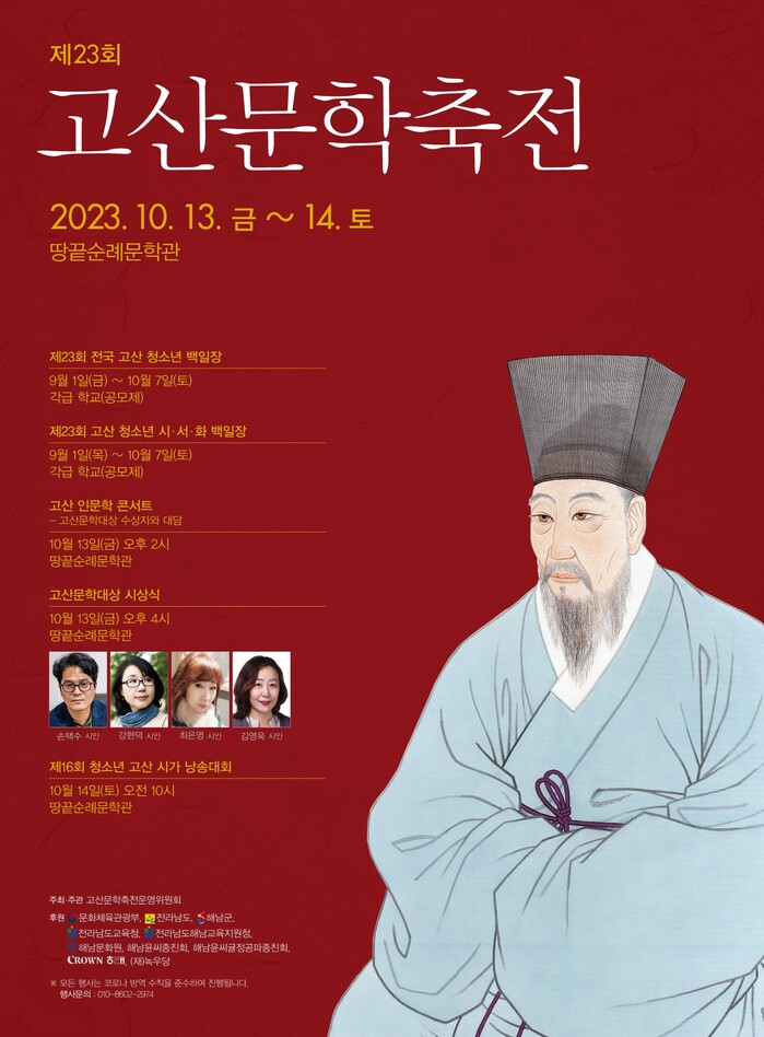 또한 14일에는 고산 청소년 시가낭송대회가 열린다. 우리말글의 아름다움을 한껏 느낄 수 있는 시가낭송대회는 고산으로부터 시작된 시문학의 고장, 해남의 특성을 잘 드러내는 프로그램으로 자리매김하고 있다. 고산 청소년 시서화 백일장은 공모를 통해 7일까지 접수하고 있다.