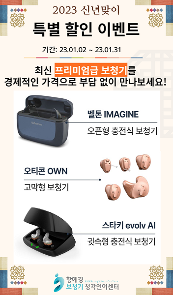 이번 이벤트는 1월 한달동안 진행되며, 벨톤 이매진(Imagine) 오픈형 보청기, 오티콘 오운(Own) 귓속형보청기, 스타키 이볼브(Evolv AI) 충전식 귓속형 보청기에 한하여 특별 할인 혜택을 제공한다.
