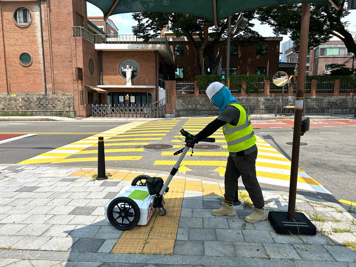 | ▲ 보도용 GPR를 활용해 도로 하부 공동탐사를 시행하고 있는 모습. (사진=성동구청 제공) |