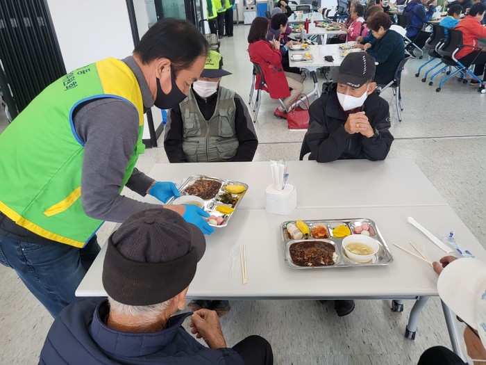 경기 여주시 중앙동지역사회보장협의체와 중앙동주민자치위원회가 최근 ‘요리하GO!나누GO!’ 사업의 일환으로 지역내 저소득 노인들을 대상으로 짜장밥 나눔행사를 개최했다. 사진은 이날 대상 노인들에게 짜장밥을 대접하고 있는 모습. (사진제공=여주시청)