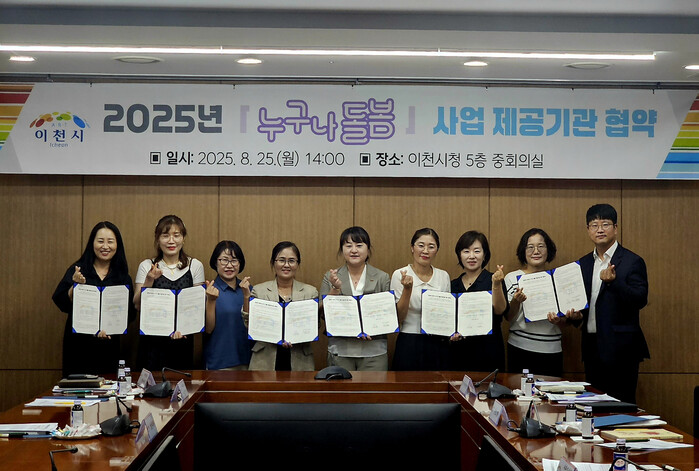 경기 이천시는 25일 시청 5층 중회의실에서 ‘2025년 누구나 돌봄 신규 제공기관 협약식’을 개최했다. 이번 협약식에는 지역 돌봄서비스 제공을 위해 새롭게 참여하는 7개 신규 기관이 함께했다. 사진은 관계자들이 협약서를 들고 기념 촬영을 하는 모습. (사진=이천시청 제공)