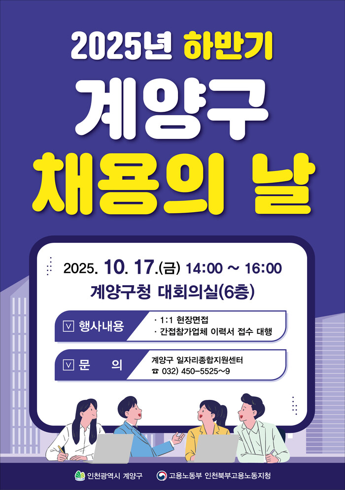 [인천=문찬식 기자] 인천 계양구(구청장 윤환)는 오는 10월 17일(금) 오후 2시부터 4시까지 구청 6층 대회의실에서 ‘2025년 하반기 계양구 채용의 날’을 개최한다.