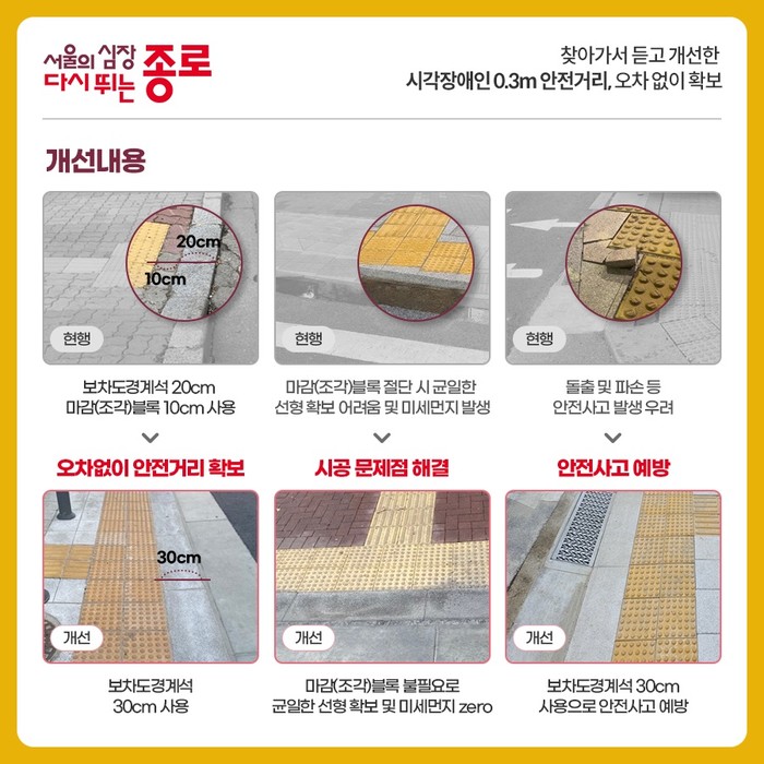 그동안 구는 보차도경계석(20cm) 설치 후 마감블록(조각, 10cm)을 사용해 관련 규정을 준수해 왔으나, 깨짐이나 돌출·침하 등이 지속적으로 발생해 보행약자 안전을 위협하고 있었다.