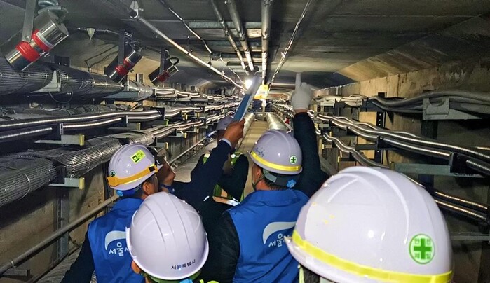서울시는 설 연휴를 앞두고 지하 공동구 특별점검에 나섰다고 5일 밝혔다. 지하 공동구는 업무시설 밀집 지역, 대규모 주거 지역 등에 공급되는 전력·통신·수도·가스 등의 관로를 한데 모아 관리하는 도심의 핵심 기반 시설이다. 사진은 지하 공동구 안전점검 모습.
