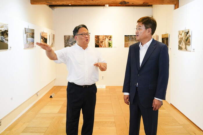 정문헌 서울 종로구청장이 20일 북촌한옥청에서 열린 흰개미 피해 사진전에 참석했다. 사진은 작품을 관람하고 있는 정 구청장(오른쪽)의 모습. (사진=종로구청 제공)