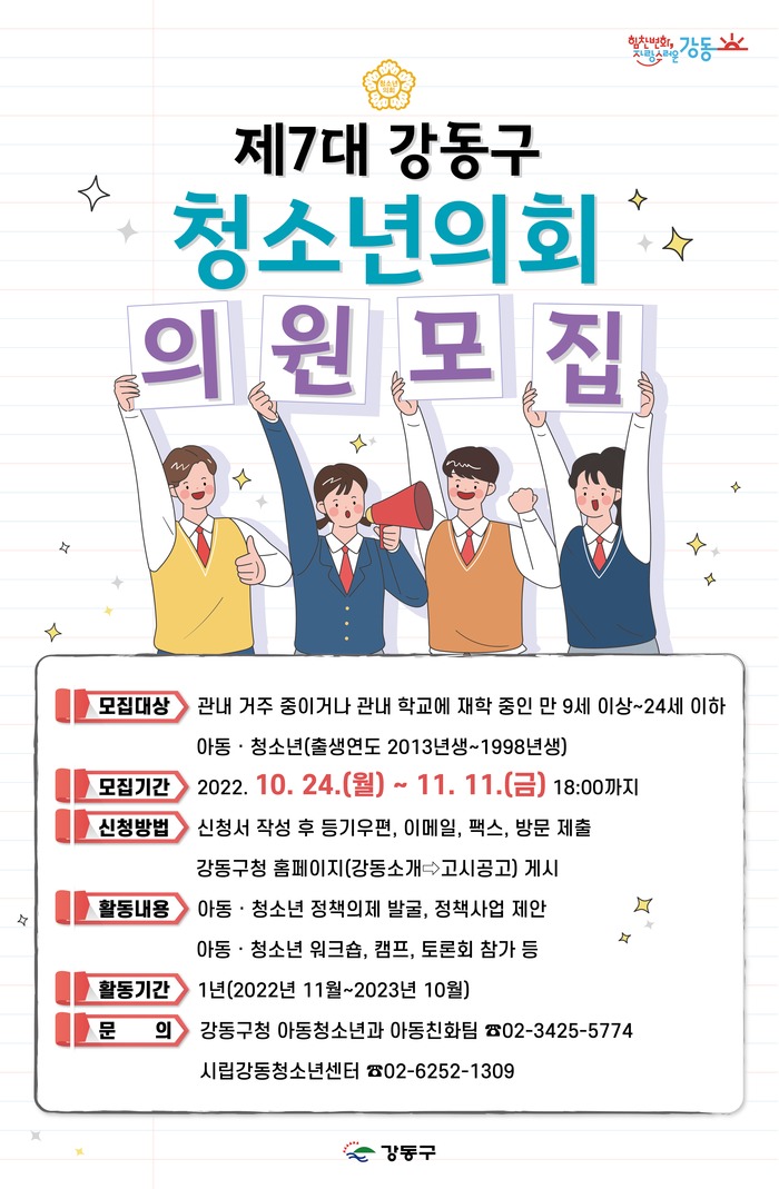 [시민일보 = 이대우 기자] 서울 강동구(구청장 이수희)가 지역내 아동?청소년을 대상으로 ‘제7대 강동구 청소년의회’ 의원을 오는 11월 11일까지 모집한다.
