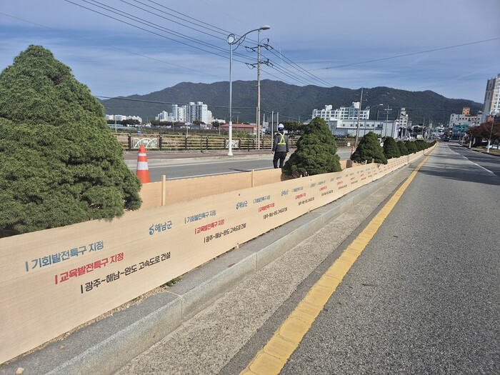이에 따라 해남군은 올해 시범적으로 폴리프로필렌 직물 소재의 방풍 벽을 새롭게 설치했다. 시범 설치 대상지는 고도교차로~해남교차로 중앙 화단과 남부순환로 등 총 3㎞이다.