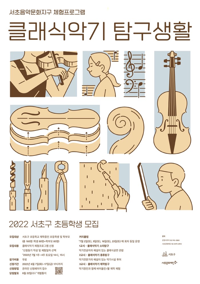[시민일보 = 이대우 기자] 서울 서초구가 오는 7월2일부터 초등학생들에게 클래식 악기를 보고, 듣고, 만드는 ‘클래식악기 탐구생활’을 운영한다.