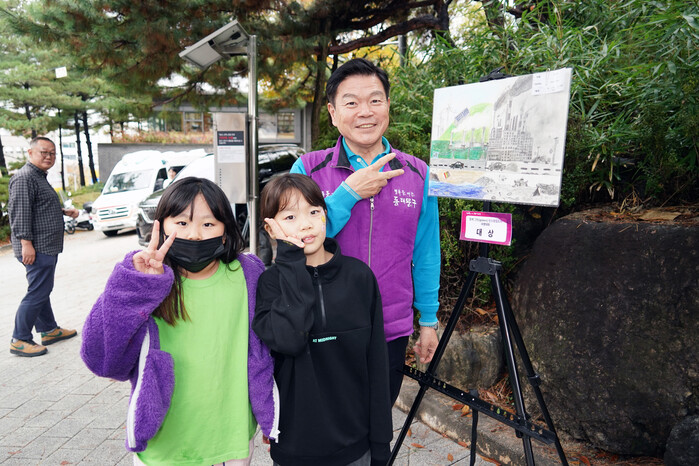 | ▲ 탄소중립도시 사생대회 대상 수상 작품 앞에서 이필형 구청장과 학생들이 사진을 찍고 있다. (사진=동대문구청 제공) |