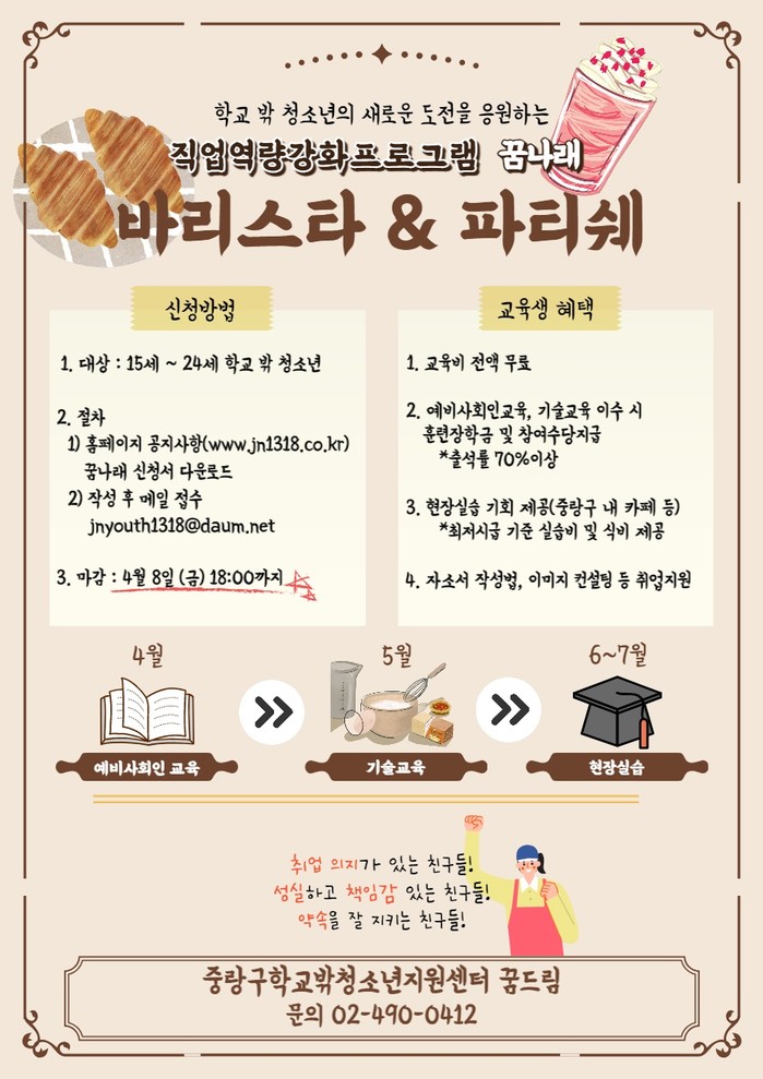중랑구학교밖청소년지원센터 꿈드림에서 진행하는 이번 프로그램은 바리스타와 파티쉐 과정이 진행될 예정이다. 교육 프로그램 참여 대상은 15세부터 24세까지의 학교 밖 청소년이다.
