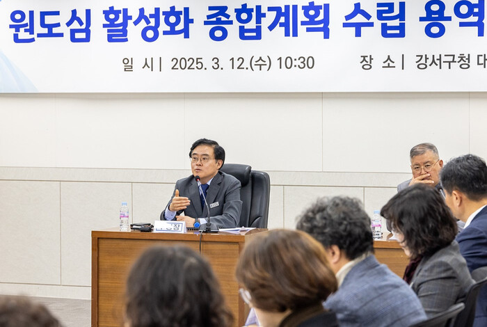 강서구가 12일 구청 대회의실에서 '2040 강서구 원도심 활성화 종합계획 수립 용역보고회'를 개최하고, 안정적이고 체계적인 정비사업을 추진하기 위한 방안을 논의했다. 사진은 보고회에서 진교훈 구청장이 발언하는 모습. (사진=강서구청 제공)