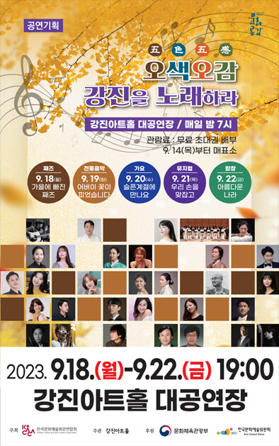 이 공연은 문예회관과 함께하는 방방곡곡 문화공감 사업으로 한국문화예술회관연합회가 주최하고 문화체육관광부와 한국문화예술위원회가 후원하며 강진군이 7년째 공모사업에 선정돼 관람료는 무료다. 자세한 사항은 강진아트홀로 문의하면 된다.