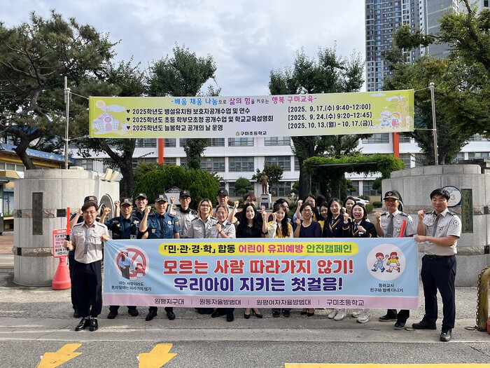 [구미=박병상 기자] 구미경찰서 원평지구대는 22일 원평동소재 구미초등학교 일원에서『민·관·경·학』협업 초등학교 등하굣길 어린이 유괴예방 안전문화 캠페인을 개최하였다.