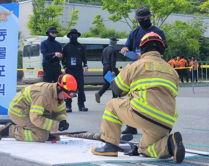 | ▲ 강진소방서 소방공무원들이 지난 3일 광주광역시 소재 중앙소방학교에서 열린 제37회 전국 소방기술경연대회 생활안전분야에 출전해 경연을 펼치고 있다. / 강진소방서 제공 |