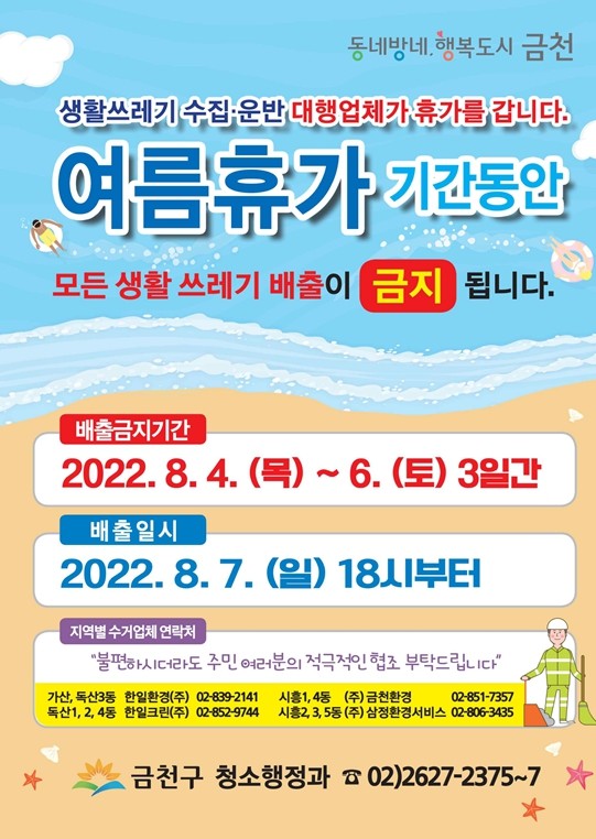 주민들은 오는 8월4일 오후 6시부터 8월6일까지 생활쓰레기 배출이 금지되며, 환경미화원 휴가 기간 이후인 8월7일 오후 6시부터는 배출할 수 있다.