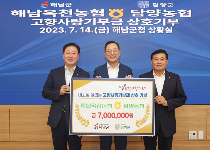 [해남=정찬남 기자] 전남 해남옥천농협과 담양농협은 고향사랑기부제의 성공적인 정착과 지역 간 상생발전을 위해 각 조합 임직원 70명의 뜻을 모아 마련한 기부금 700만 원씩을 상호 기부했다.