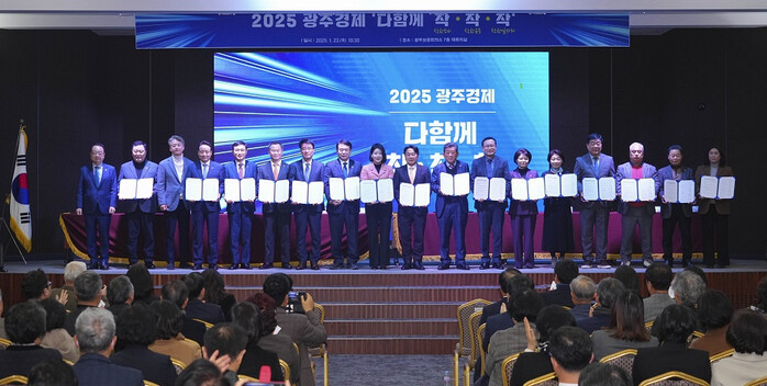 | ▲ 강기정 광주광역시장(왼 쪽부터 10번 째)이 23일 오전 서구 광주상공회의소에서 열린 2025 광주경제 '다함께 착착착(착한소비·착한금융·착한일자리)' 행사에 참석해 경제, 금융, 지자체, 소상공인 등과 다함께 결의문 서명을 한 뒤 기념촬영을 하고 있다./광주광역시 제공 |
