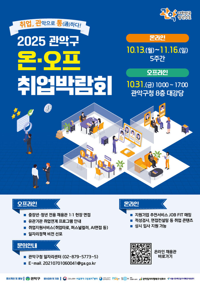오프라인 채용관은 오는 31일 관악구청 8층 대강당에서 오전 10시부터 오후 5시까지 진행된다. 현장 면접이 가능한 ‘채용관’ 외에도 ▲유관기관 취업지원 프로그램 안내 ▲인공지능(AI) 면접 ▲취업타로 상담 ▲퍼스널컬러 진단 ▲이력서 사진촬영 등 다양한 부대행사도 마련된다.