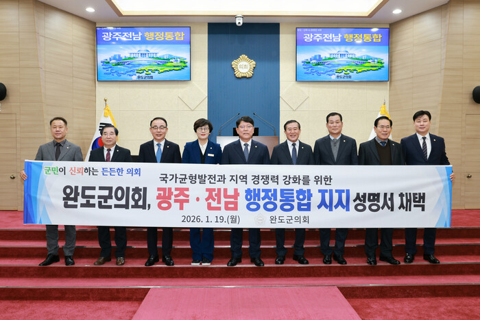 김양훈 완도군의회 의장은 “광주·전남 행정통합은 전남의 미래를 살리고 다음 세대에 희망을 주기 위한 중요한 전환점”이라며 “완도군의회는 통합 논의가 선언에 그치지 않고 실질적인 실행으로 이어질 수 있도록 책임 있는 논의와 실천에 적극 동참하겠다”고 밝혔다.